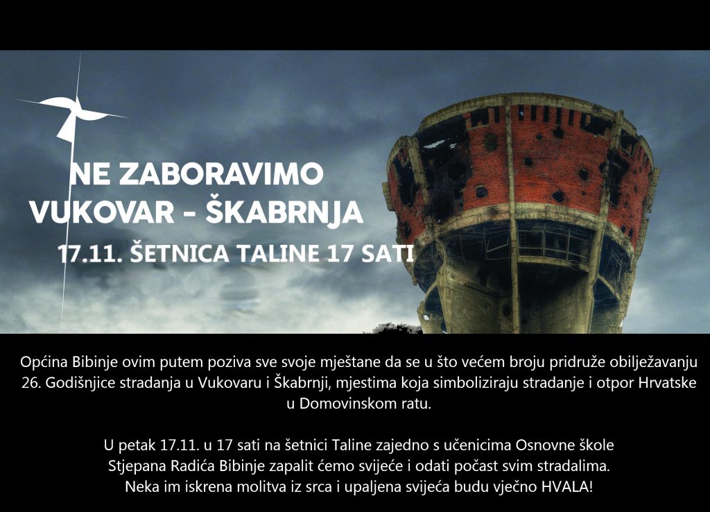 Općina Bibinje ovim putem poziva sve svoje mještane da se u što većem broju pridruže obilježavanju 26. Godišnjice stradanja u Vukovaru i Škabrnji, mjestima koja simboliziraju stradanje i otpor Hrvatske u Domovinskom ratu.