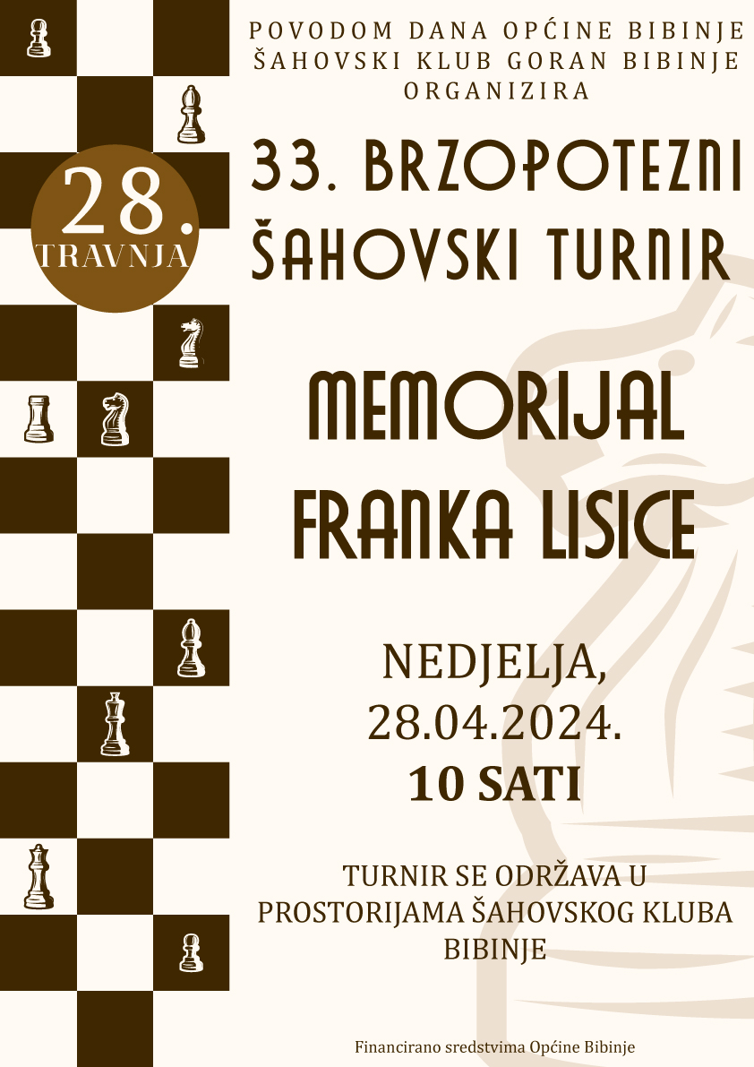 Povodom Dana Općine Bibinje, u nedjelju 28. travnja s početkom u 10 sati u prostorijama šahovskog kluba Goran, održat će se 33. izdanje šahovskog memorijala ˝Franko Lisica˝ .